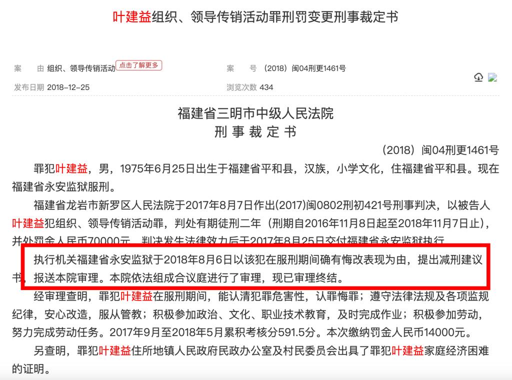 2018年12月,中國裁判文書網(wǎng)另披露過一份《葉建益組織、領導傳銷活動罪刑罰變更刑事裁定書》,福建省三明市中級人民法院公開的一份刑事裁定書顯示,執(zhí)行機關福建省永安監(jiān)獄于2018年8月6日以該犯在服刑期間確有悔改表現(xiàn)為由,提出減刑建議書,報送本院審理。本院認為,罪犯葉建益在服刑期間確有悔改表現(xiàn),符合減刑條件。裁定:對罪犯葉建益減去有期徒刑二個月,刑期自2016年11月8日起至2018年9月7日止。