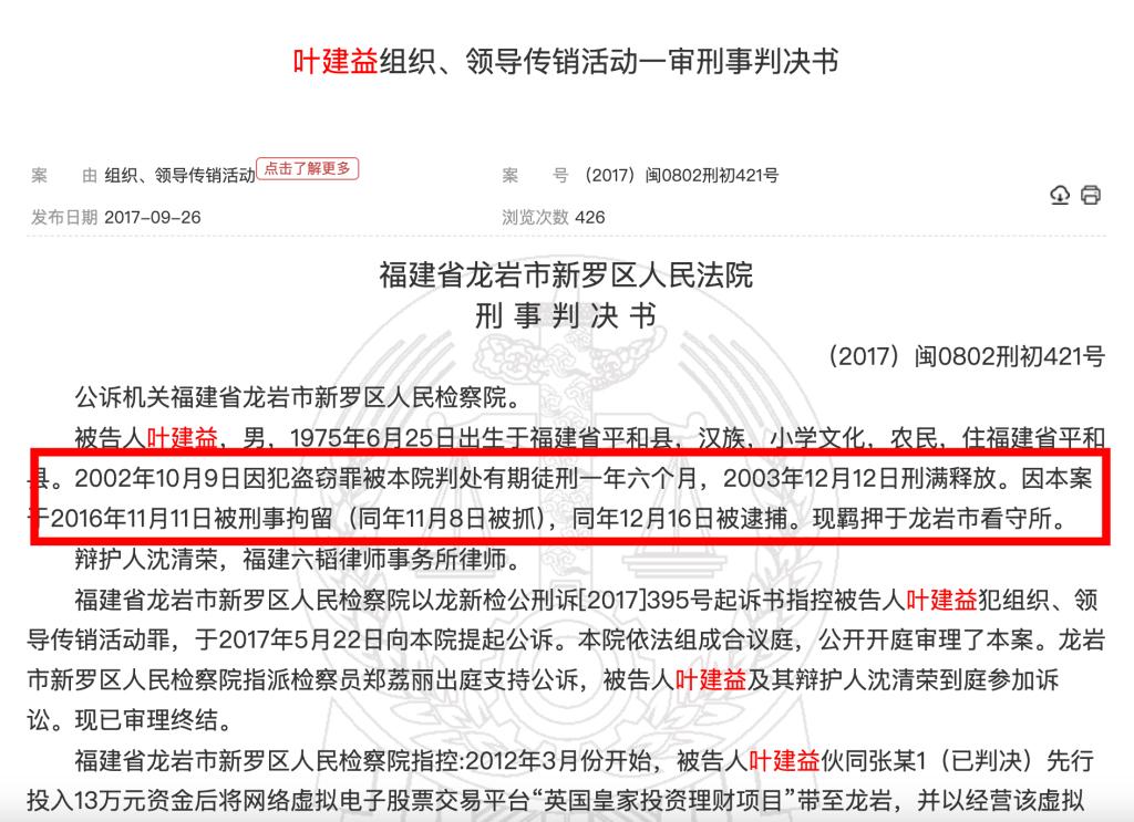 澎湃新聞根據(jù)中國裁判文書網(wǎng)檢索發(fā)現(xiàn),福建省龍巖市新羅區(qū)人民法院于2017年9月公開的一份刑事判決書顯示,葉建益1975年出生,小學文化,2002年因盜竊罪獲刑一年六個月,于2003年12月釋放;2016年又因組織、領導傳銷活動罪被判處有期徒刑二年,涉案60余人、涉案金額130余萬元。
