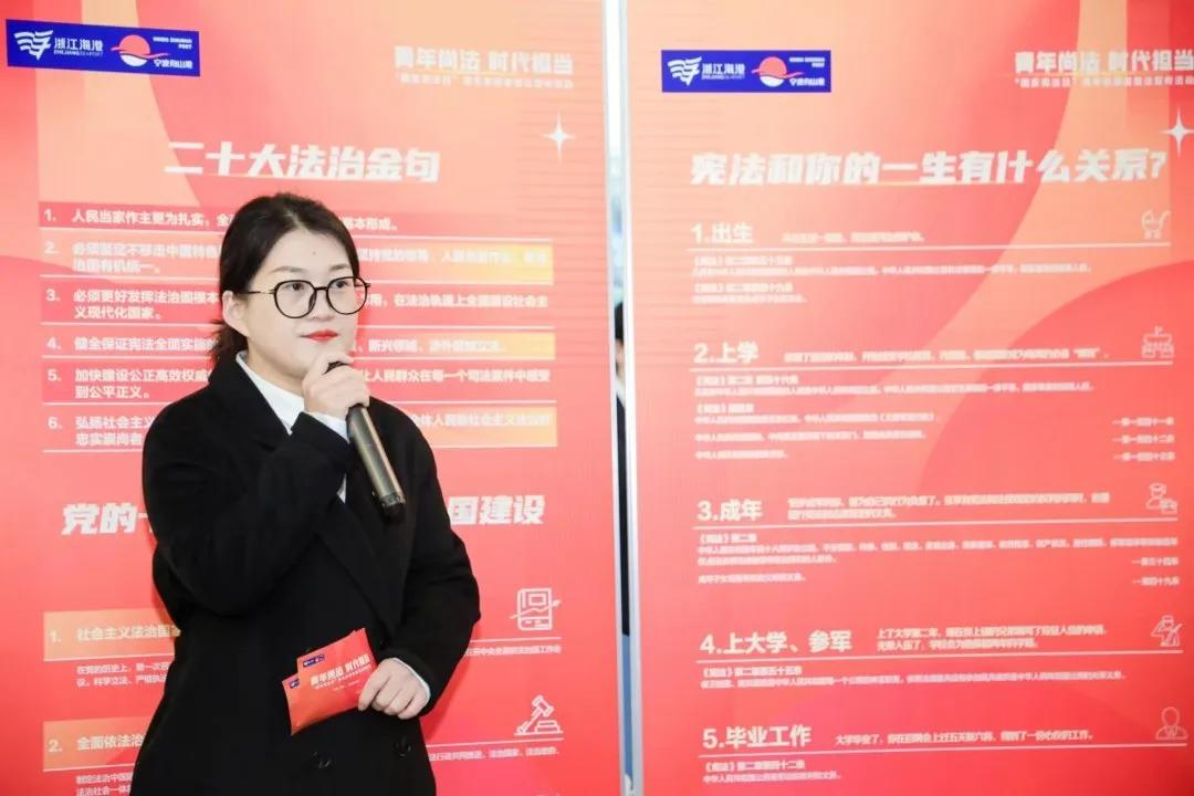 活動現(xiàn)場特別設(shè)置了憲法授課、憲法飛行棋、法律連連看、“法”影重重、法律問答、合規(guī)分分樂等六個法律主題趣味互動區(qū)域,通過“學(xué)憲集章”打卡的形式,引導(dǎo)參與者在參觀中學(xué)習(xí)、在互動中領(lǐng)悟,現(xiàn)場學(xué)習(xí)氛圍濃厚。憲法館講解員與集團(tuán)普法志愿者也同步在現(xiàn)場向廣大群眾開展憲法法治和海港法治建設(shè)實踐宣傳。