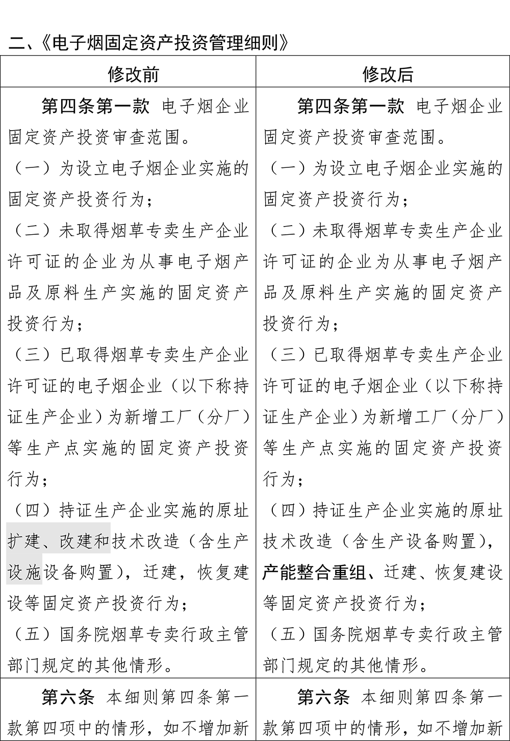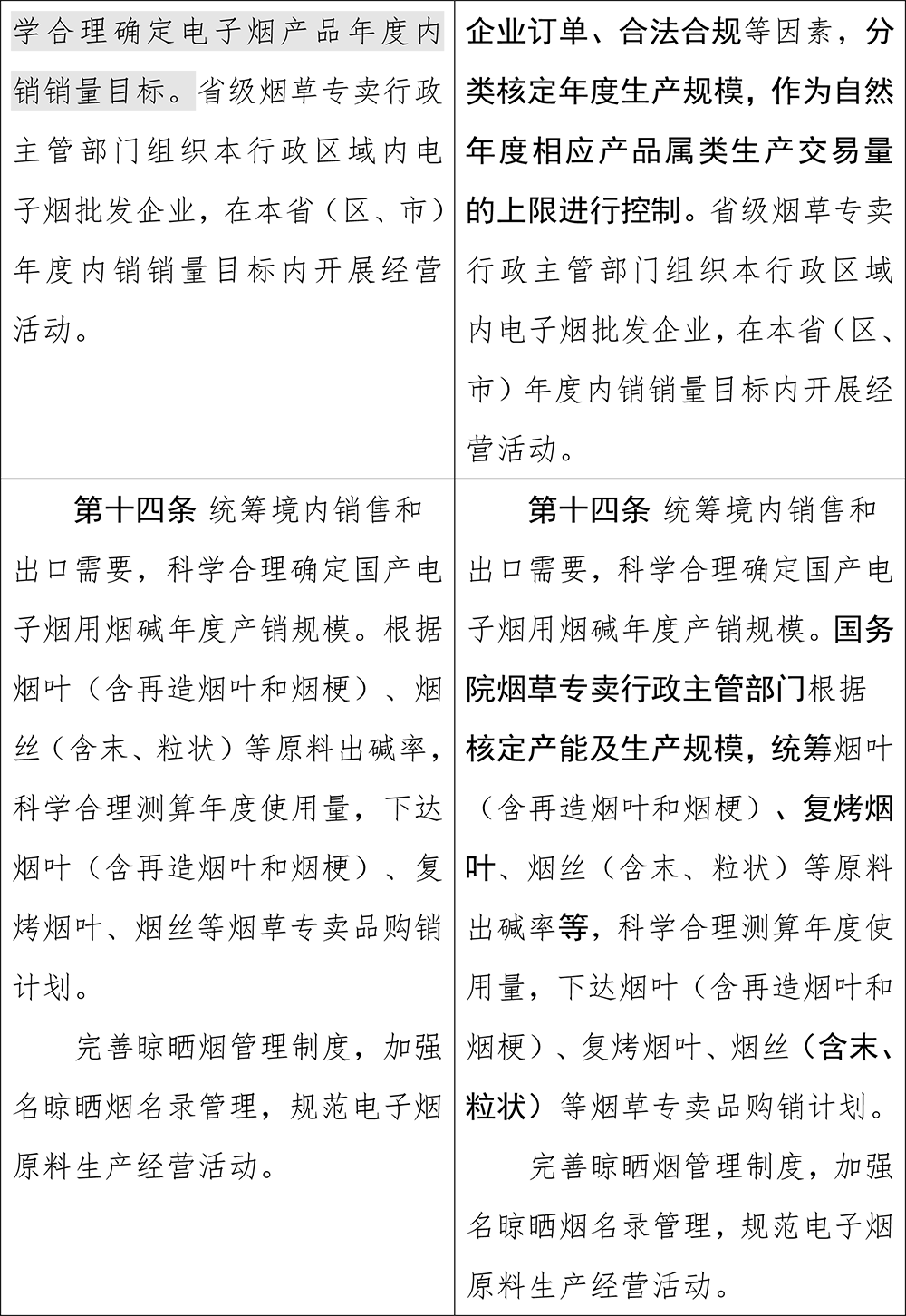 在該條修改之前,只是“對(duì)境內(nèi)電子煙產(chǎn)品銷售進(jìn)行總量管理”,且進(jìn)行總量控制的綜合考慮因素包括“經(jīng)濟(jì)發(fā)展、人口變化、市場(chǎng)狀態(tài)”,修改后刪除這三個(gè)考慮因素,但新增“核定產(chǎn)能、企業(yè)訂單、合法合規(guī)”因素,并要分類核定年度生產(chǎn)規(guī)模,作為自然年度相應(yīng)產(chǎn)品屬類生產(chǎn)交易量的上限進(jìn)行控制。