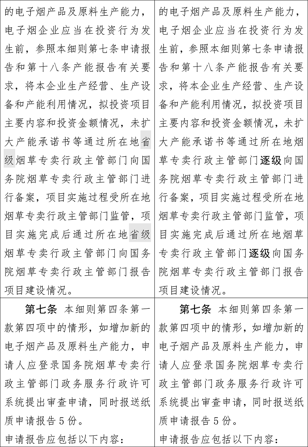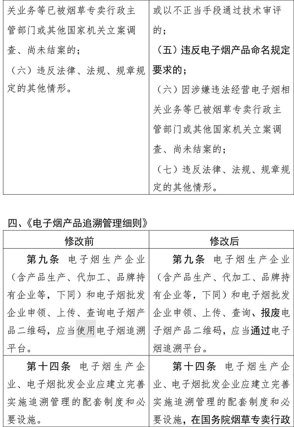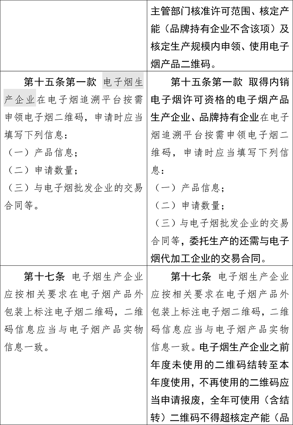 第十四條修改為“電子煙生產(chǎn)企業(yè)、電子煙批發(fā)企業(yè)應(yīng)建立完善實(shí)施追溯管理的配套制度和必要設(shè)施,在國(guó)務(wù)院煙草專賣行政主管部門(mén)核準(zhǔn)許可范圍、核定產(chǎn)能(品牌持有企業(yè)不含該項(xiàng))及核定生產(chǎn)規(guī)模內(nèi)申領(lǐng)、使用電子煙產(chǎn)品二維碼”,而在此前,第十四條只是要求“電子煙生產(chǎn)企業(yè)、電子煙批發(fā)企業(yè)應(yīng)建立完善實(shí)施追溯管理的配套制度和必要設(shè)施”,并無(wú)更細(xì)化的要求。