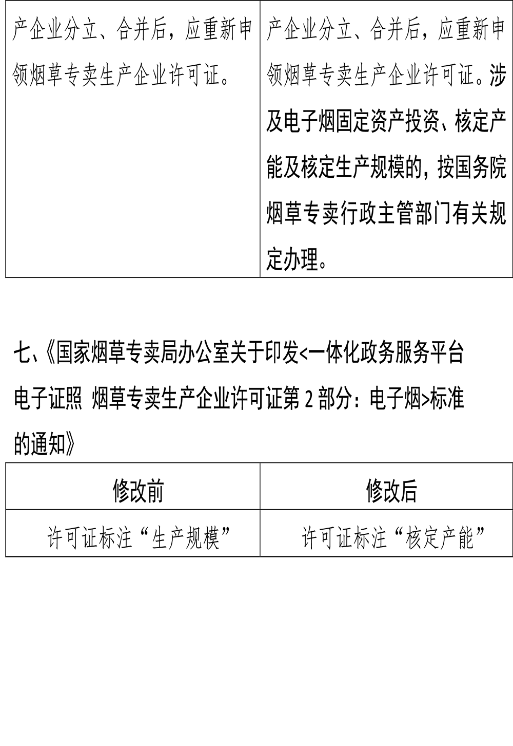 此外,《電子煙相關(guān)生產(chǎn)企業(yè)設(shè)立、分立、合并、撤銷管理細(xì)則》第二十二條,新增“電子煙相關(guān)生產(chǎn)企業(yè)分立、合并后,涉及電子煙固定資產(chǎn)投資、核定產(chǎn)能及核定生產(chǎn)規(guī)模的,按國(guó)務(wù)院煙草專賣行政主管部門(mén)有關(guān)規(guī)定辦理”?!秶?guó)家煙草專賣局辦公室關(guān)于印發(fā)<一體化政務(wù)服務(wù)平臺(tái) 電子證照 煙草專賣生產(chǎn)企業(yè)許可證第2部分:電子煙>標(biāo)準(zhǔn)的通知》則是要求將許可證標(biāo)注“生產(chǎn)規(guī)?!毙薷臑闃?biāo)注“核定產(chǎn)能”。