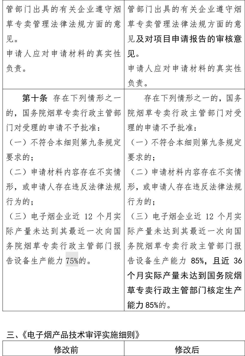 《電子煙固定資產(chǎn)投資管理細(xì)則》的修改涉及五處,其中,第十條第三項(xiàng)不予批準(zhǔn)情形收緊:電子煙企業(yè)近12個(gè)月實(shí)際產(chǎn)量未達(dá)到其最近一次向國(guó)務(wù)院煙草專賣行政主管部門(mén)報(bào)告設(shè)備生產(chǎn)能力85%,且近36個(gè)月實(shí)際產(chǎn)量未達(dá)到國(guó)務(wù)院煙草專賣行政主管部門(mén)核定生產(chǎn)能力85%的。國(guó)務(wù)院煙草專賣行政主管部門(mén)對(duì)受理的申請(qǐng)不予批準(zhǔn)。