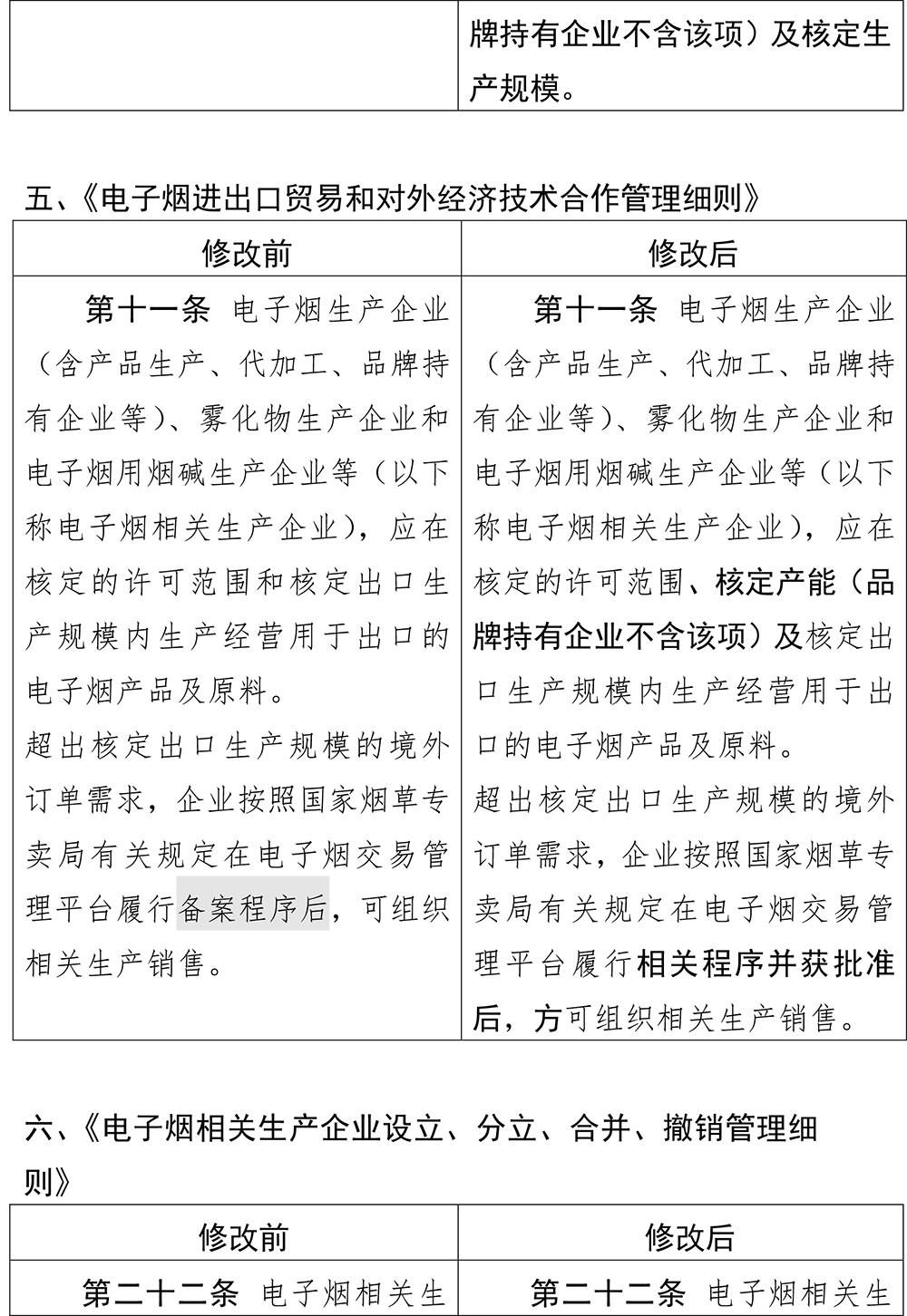 《電子煙進(jìn)出口貿(mào)易和對(duì)外經(jīng)濟(jì)技術(shù)合作管理細(xì)則》修改了一處,修改后的第十條,是要求電子煙生產(chǎn)企業(yè)(含產(chǎn)品生產(chǎn)、代加工、品牌持有企業(yè)等)、霧化物生產(chǎn)企業(yè)和電子煙用煙堿生產(chǎn)企業(yè)等(以下稱電子煙相關(guān)生產(chǎn)企業(yè)),應(yīng)在核定的許可范圍、核定產(chǎn)能(品牌持有企業(yè)不含該項(xiàng))及核定出口生產(chǎn)規(guī)模內(nèi)生產(chǎn)經(jīng)營(yíng)用于出口的電子煙產(chǎn)品及原料。超出核定出口生產(chǎn)規(guī)模的境外訂單需求,企業(yè)按照國(guó)家煙草專賣局有關(guān)規(guī)定在電子煙交易管理平臺(tái)履行相關(guān)程序并獲批準(zhǔn)后,方可組織相關(guān)生產(chǎn)銷售。