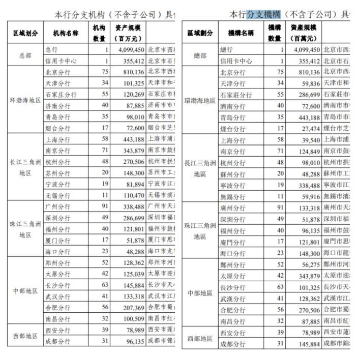 中新網(wǎng)記者對比兩份公告發(fā)現(xiàn),除北京分行、西安分行、悉尼分行、澳門分行等少數(shù)分支機(jī)構(gòu)數(shù)據(jù)一致外,40家分支機(jī)構(gòu)的資產(chǎn)規(guī)模出現(xiàn)較大出入。