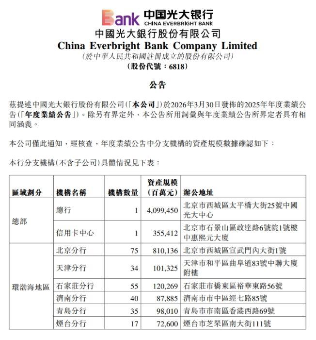 4月1日晚,光大銀行在港交所發(fā)布公告,對分支機(jī)構(gòu)的資產(chǎn)規(guī)模數(shù)進(jìn)行了確認(rèn)。從公告發(fā)布數(shù)據(jù)來看,光大銀行對之前在港交所披露的數(shù)據(jù)進(jìn)行了變更,變更后的數(shù)據(jù)與上交所發(fā)布的2025年年報(bào)數(shù)據(jù)保持一致。