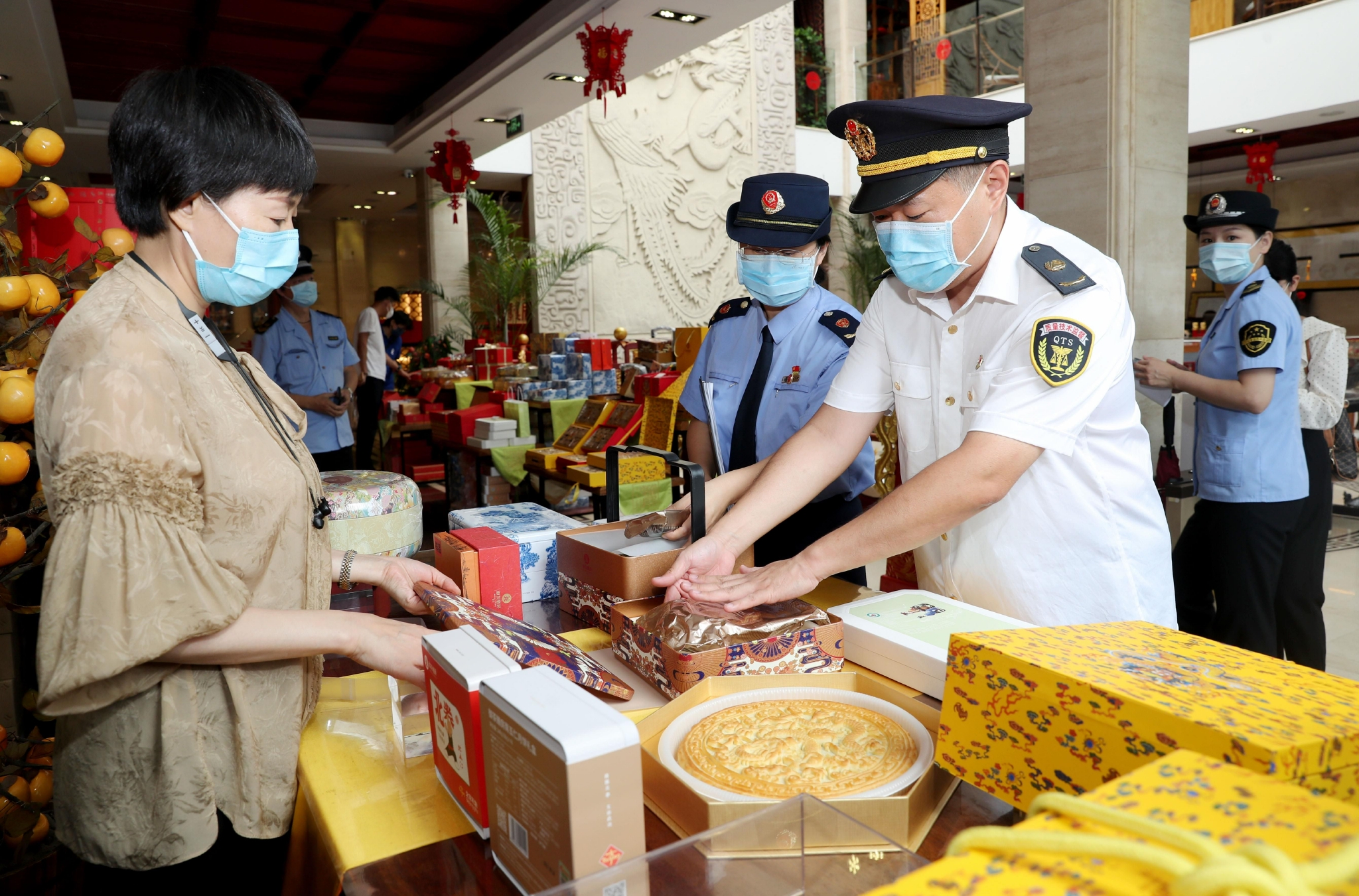 執(zhí)法人員對(duì)出廠前的月餅進(jìn)行包裝檢查。