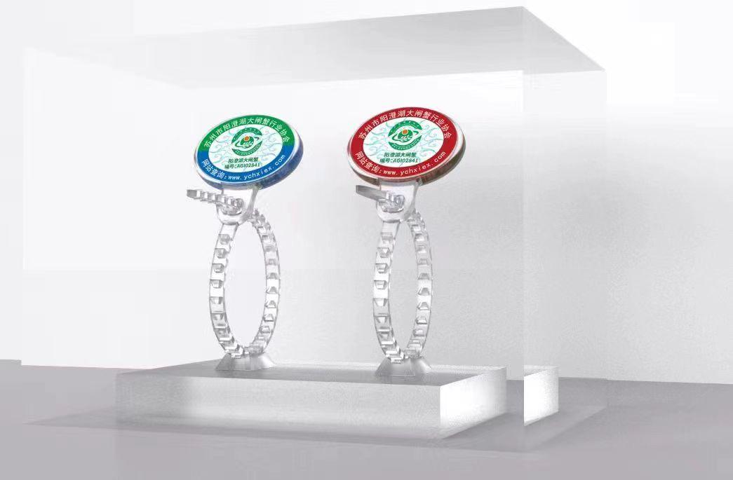 協(xié)會(huì)根據(jù)養(yǎng)殖戶的養(yǎng)殖面積,按照大閘蟹成熟度分批次發(fā)放防偽蟹扣。2022年版陽澄湖大閘蟹農(nóng)產(chǎn)品地理標(biāo)志防偽專用標(biāo)識(shí)分為兩種,一種是深紅色,代表陽澄湖湖區(qū)的大閘蟹;另一種是綠色加藍(lán)色,代表高標(biāo)準(zhǔn)養(yǎng)殖池塘的大閘蟹。通過顏色,消費(fèi)者很容易辨別蟹的產(chǎn)地。