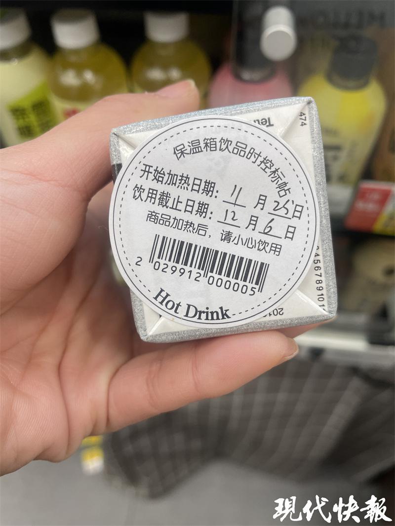 放在暖柜中的飲料,安全飲用期限最受關(guān)注。在走訪中,現(xiàn)代快報記者注意到,大部分放置在便利店暖柜中的飲料,都會加貼一張產(chǎn)品標(biāo)簽。這份產(chǎn)品標(biāo)簽叫作保溫箱飲品時控標(biāo)貼,包含了飲品的開始加熱日期和飲用截止日期。按照飲品類別的不同,飲品時控的天數(shù)也不一樣。但是幾乎所有飲品在經(jīng)過加熱保溫處理后的保質(zhì)期,都比常溫狀態(tài)下的保質(zhì)期縮短了不少。以一款常溫狀態(tài)下保質(zhì)期為 9 個月的飲品為例,它在暖柜中經(jīng)過加熱后,僅有 14 天的賞味期。
