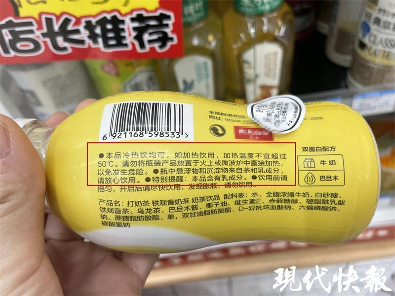 按照這名工作人員的指示,記者查看了暖柜中飲料的瓶身標(biāo)識。在加熱飲料的瓶身上,都用文字標(biāo)注了 " 本品冷熱飲均可,如加熱飲用,加熱溫度不宜超過 50 ℃。"" 冷熱飲均可,熱飲時請注意,避免燙傷。"
