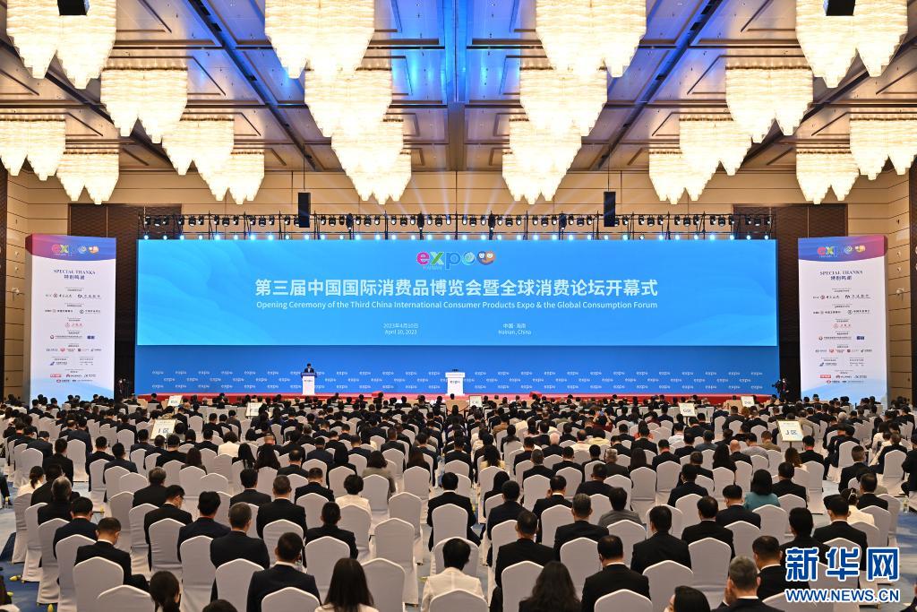 第三屆中國(guó)國(guó)際消費(fèi)品博覽會(huì)開幕,這是4月10日拍攝的開幕式現(xiàn)場(chǎng)。當(dāng)日,第三屆中國(guó)國(guó)際消費(fèi)品博覽會(huì)在海南海口開幕。本屆消博會(huì)以“共享開放機(jī)遇、共創(chuàng)美好生活”為主題,將助力消費(fèi)恢復(fù)和升級(jí),為各國(guó)企業(yè)共享中國(guó)市場(chǎng)提供機(jī)遇。新華社記者 李鑫 攝