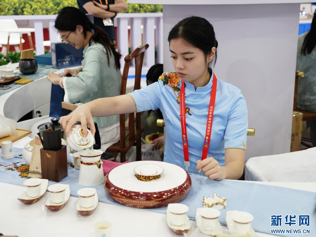 4月10日,消博會(huì)福建展臺(tái)的工作人員在為參觀者沏茶。當(dāng)日,第三屆中國(guó)國(guó)際消費(fèi)品博覽會(huì)在海南??陂_幕。本屆消博會(huì)以“共享開放機(jī)遇、共創(chuàng)美好生活”為主題,將助力消費(fèi)恢復(fù)和升級(jí),為各國(guó)企業(yè)共享中國(guó)市場(chǎng)提供機(jī)遇。新華社記者 樊雨晴 攝