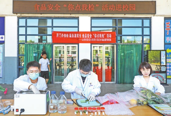 “您好,我們可以自己選擇檢測食品嗎?”6月21日,在太原學院餐廳門前,很多大學生圍在山西綜改區(qū)市場監(jiān)管局設立的“你點我檢”桌前向工作人員提問。該局食品監(jiān)管科副科長吳煒耐心給學生們講解:“沒問題,咱們掃碼后可以根據(jù)需求選擇,我們會根據(jù)大家的選擇進行相關檢測?!睅孜粚W生在吳煒的引導下進行了操作,同時觀看了食品安全快檢流程。“我們的餐桌就靠你們監(jiān)督,必須給你們點贊!”幾位同學對市場監(jiān)管部門的工作表示贊揚。