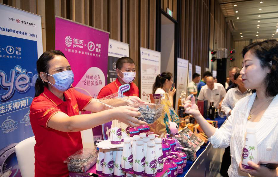 8月29日,在廣東省深圳市舉行的進(jìn)博會展前供需對接活動上,參展商(左)向采購商介紹進(jìn)口藍(lán)莓。