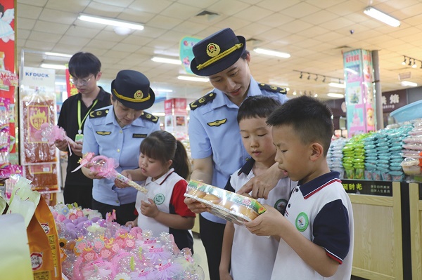 圖為該局執(zhí)法人員邀請小學生志愿者一起走進超市,全程參與抽檢活動。