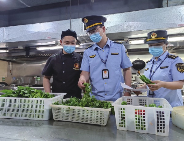 圖為檢測(cè)人員在對(duì)供餐點(diǎn)的蔬菜進(jìn)行快檢。