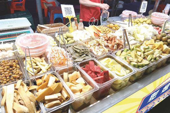 夏季的傍晚,走進(jìn)南寧平西夜市,酸嘢攤前總是圍滿了人。透明的玻璃缸中浸泡著各種水果和蔬菜,色彩斑斕,味道各異。“老板,來一份酸嘢?!薄跋氤允裁醋约哼x?!笔晨湍闷鹦』@子,挑選了李子、菠蘿、芒果、番石榴、木瓜……老板接過小籃子,配以椒鹽粉、辣椒粉、甘草粉等調(diào)料混合攪拌。一塊酸嘢入口,咸辣鮮香,酸爽開胃。