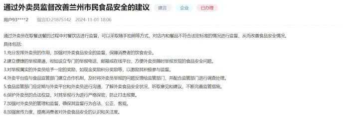 對于網(wǎng)友建議,蘭州市市場監(jiān)管局作出積極回應(yīng):“目前,消費(fèi)者和外賣配送人員等可通過12315電話熱線、全國12315平臺微信小程序APP及全國12315平臺網(wǎng)站等及時反映食品安全問題。我們將聯(lián)合相關(guān)外賣平臺出臺鼓勵外賣配送人員積極履行食品安全監(jiān)督職責(zé)的機(jī)制和具體措施,鼓勵其通過照片、視頻等方式留存證據(jù),加強(qiáng)對外賣食品安全的監(jiān)督,市場監(jiān)管部門將按照相關(guān)法律法規(guī)等要求對各類食品安全違法線索和舉報(bào)進(jìn)行核查處置。對于舉報(bào)屬實(shí)的,一方面按照《甘肅省食品安全舉報(bào)獎勵辦法》相關(guān)要求給予獎勵;另一方面我們也將聯(lián)合相關(guān)外賣平臺進(jìn)一步研究制定具體的獎勵方案,如以積分獎勵等形式,激發(fā)外賣員參與監(jiān)督的熱情,形成良性監(jiān)督激勵機(jī)制。”