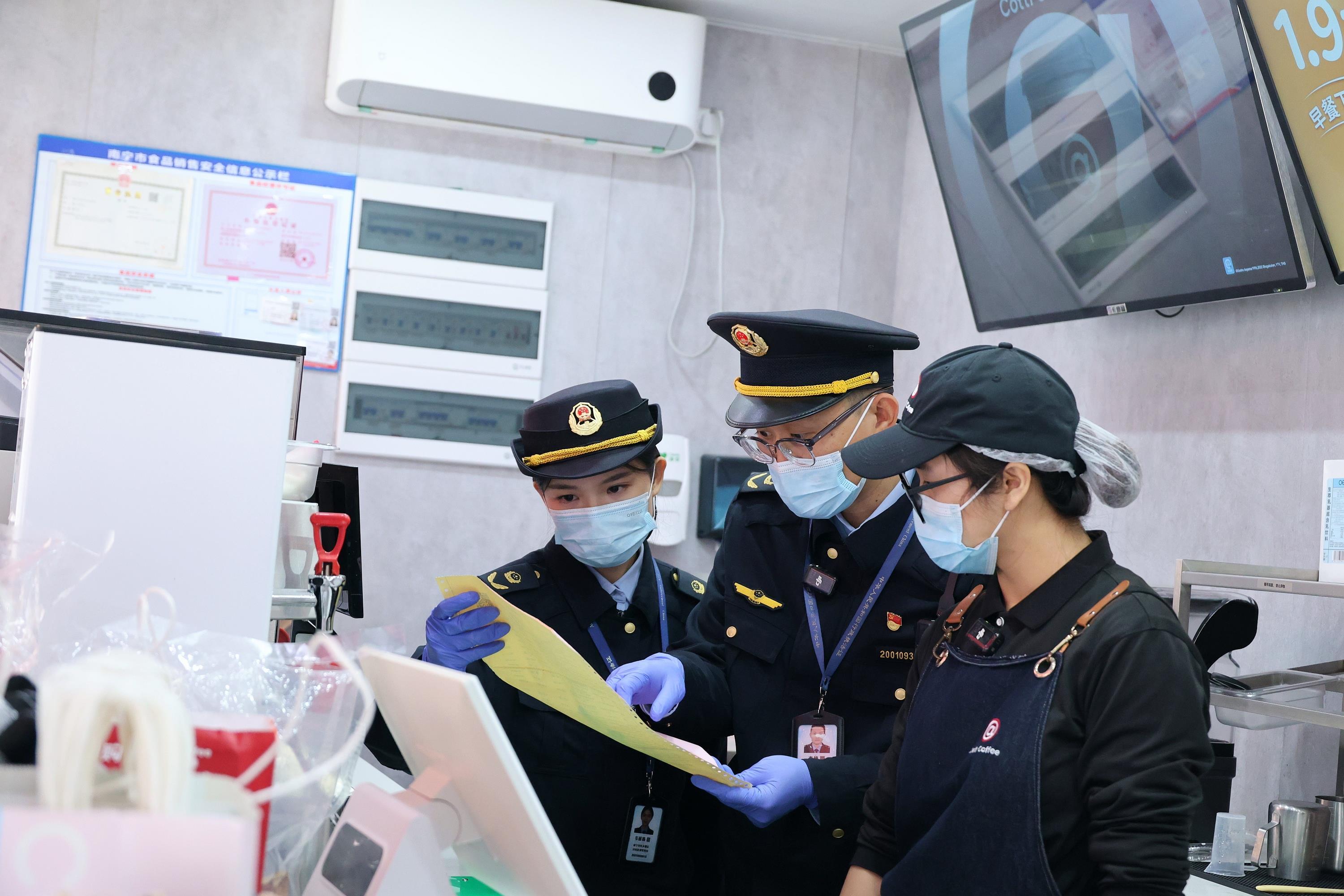 12月15日,廣西壯族自治區(qū)南寧市西鄉(xiāng)塘區(qū)市場監(jiān)管局執(zhí)法人員對現(xiàn)制現(xiàn)賣飲品連鎖店開展食品安全專項檢查。執(zhí)法人員重點核查經(jīng)營者主體資質(zhì)、食材采購儲存、操作臺環(huán)境衛(wèi)生及餐廚垃圾處置等環(huán)節(jié)。(顧艷偉 何正君)