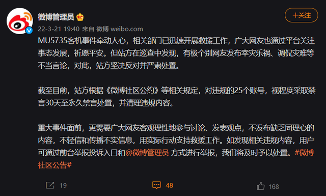 3月21日,“微博管理員”表示, MU5735 客機(jī)事件牽動人心,相關(guān)部門已迅速開展救援工作,廣大網(wǎng)友也通過平臺關(guān)注事態(tài)發(fā)展,祈愿平安。但站方在巡查中發(fā)現(xiàn),有極個別網(wǎng)友發(fā)布幸災(zāi)樂禍、調(diào)侃災(zāi)難等不當(dāng)言論,對此,站方堅決反對并嚴(yán)肅處置。