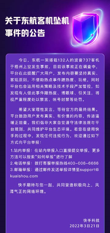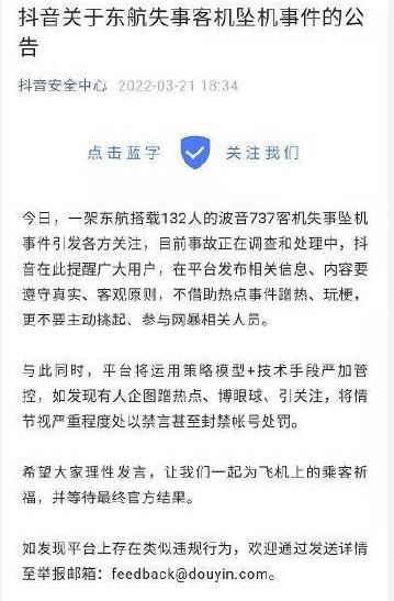 此外,快手、抖音等也都發(fā)布了關(guān)于 MU5735 客機(jī)事件的相關(guān)公告,對于借此事件蹭熱度、博眼球、引關(guān)注,將視嚴(yán)重程度處以禁言、帳號封禁等處罰。