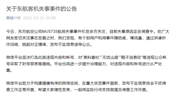 3月21日,據(jù)“微信110”公眾號消息,東方航空公司MU5735航班失事事件引發(fā)廣泛關(guān)注,目前失事原因正在調(diào)查中。在廣大網(wǎng)友密切關(guān)注事態(tài)發(fā)展之時,平臺發(fā)現(xiàn),有個別用戶利用事件蹭熱度、博流量,通過拼湊炒作舊聞,挑起對立情緒,發(fā)布不實(shí)信息誤導(dǎo)公眾。