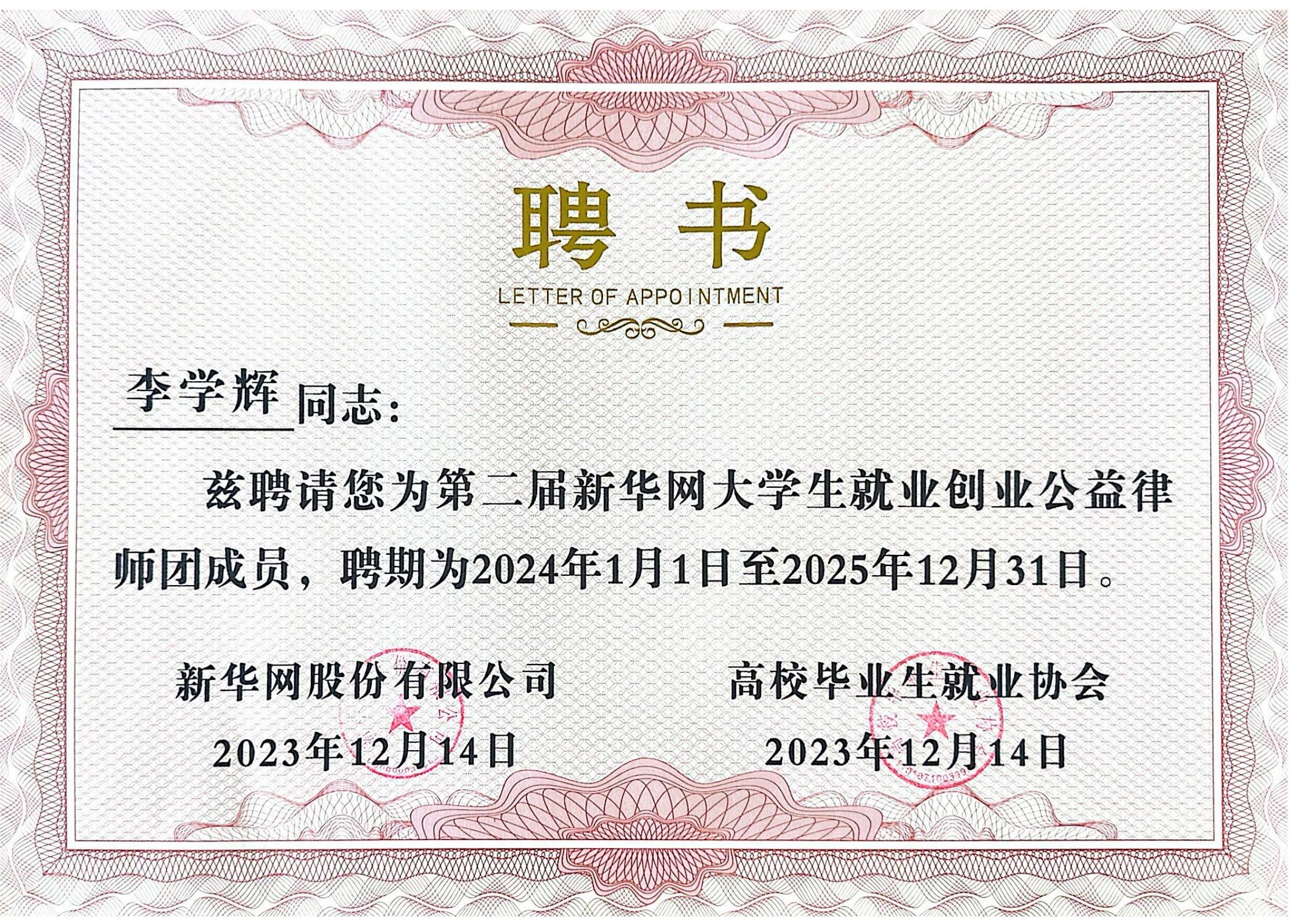 北京市安理律師事務(wù)所黨委副書記、管委會委員李學(xué)輝律師憑借扎實的法律功底、過硬的專業(yè)素養(yǎng)、應(yīng)有的責(zé)任擔(dān)當(dāng),受聘擔(dān)任新華網(wǎng)大學(xué)生就業(yè)創(chuàng)業(yè)公益律師團(tuán)成員。