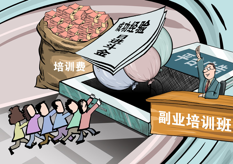 劉云的遭遇并非個例。南京大學一項調研數據顯示,我國一邊工作一邊干副業(yè)的人已經超過8000萬。如此龐大的人群,迅速點燃了職業(yè)培訓市場。從緊隨低碳風潮推出的碳排放管理師報考培訓班到伴隨直播帶貨興起的個人IP“點金術”,從60天速成月入過萬元的自媒體寫手、到學習20天就能接單的手辦課……眼花繚亂的培訓中摻雜各種亂象,讓“劉云”們成了被割的“韭菜”。