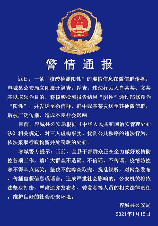 近日,一條“核酸檢測陽性”的虛假信息在雄安新區(qū)容城縣居民微信群中傳播。經(jīng)容城縣公安局調(diào)查,違法行為人肖某某、文某某以取樂為目的,將核酸檢測報告結(jié)果“陰性”通過軟件修圖為“陽性”,并發(fā)送至微信群,群中張某某發(fā)送至其他微信群,后被廣泛傳播,造成不良社會影響。