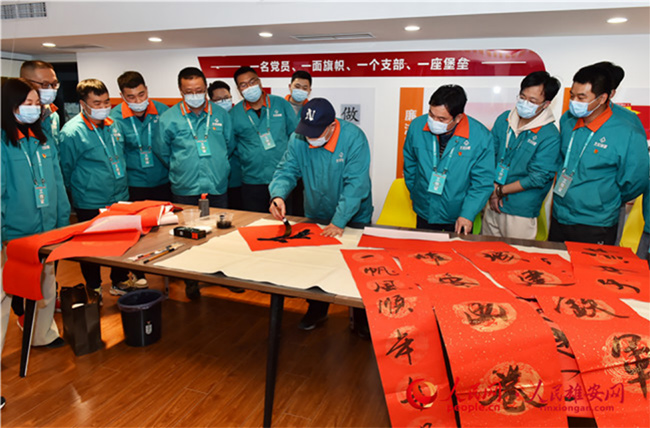 “雄安畫卷添錦繡 城建鐵軍使命達(dá)”建設(shè)者們揮毫潑墨,將美好的祝福凝于筆端,寫就一幅幅春聯(lián)?!鞍职?、媽媽,我正和同事們在項(xiàng)目上貼春聯(lián),很開心。”陳俊良是雄安容東B1組團(tuán)安置房項(xiàng)目的新人。2020年7月畢業(yè)后,陳俊良選擇來建設(shè)雄安,平時(shí)負(fù)責(zé)商務(wù)預(yù)算工作,這是23歲的他第一次在外地過年。“在雄安我成長得很快,也學(xué)到了很多東西。項(xiàng)目上有過年的氣氛,也有家里的溫暖。大家在一起其樂融融,體驗(yàn)一個(gè)不一樣的春節(jié)。”陳俊良笑道。