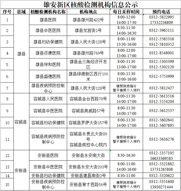 雄安新區(qū)核酸檢測機(jī)構(gòu)信息公示