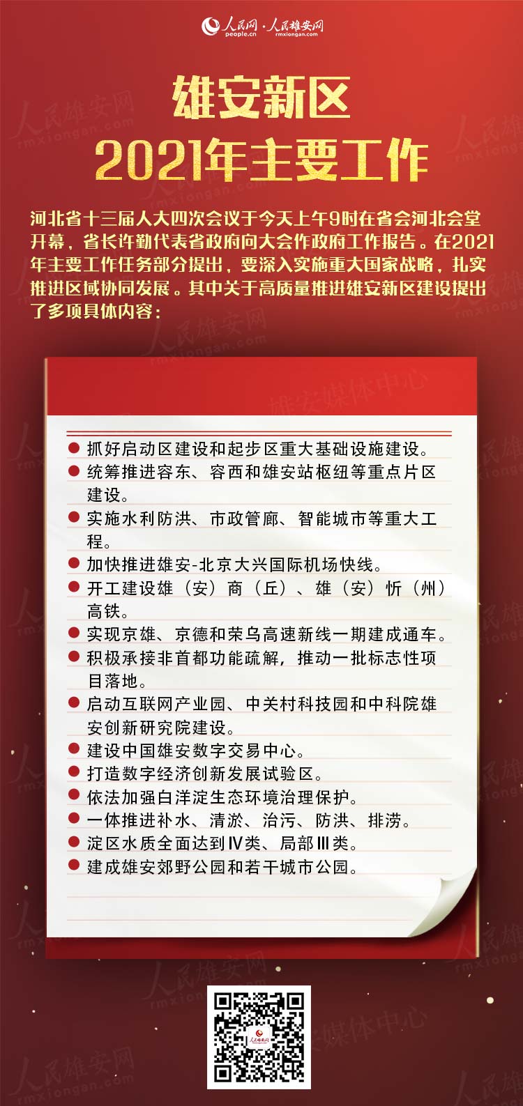 人民網(wǎng)雄安2月19日電(施云娟 竇薇) 河北省十三屆人大四次會議于今天上午9時在省會河北會堂開幕,河北省長許勤代表省政府向大會作政府工作報告。在2021年主要工作任務部分提出,要深入實施重大國家戰(zhàn)略,扎實推進區(qū)域協(xié)同發(fā)展。其中關于高質量推進雄安新區(qū)建設提出了多項具體內(nèi)容: