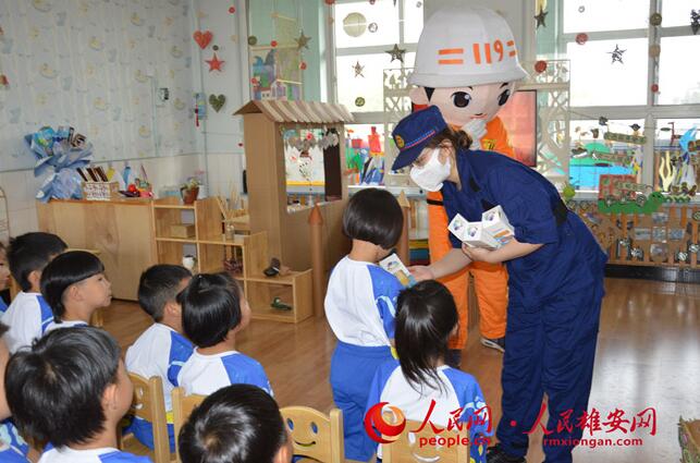 消防隊員給入園的小朋友和家長發(fā)放宣傳資料。趙淑晴/攝