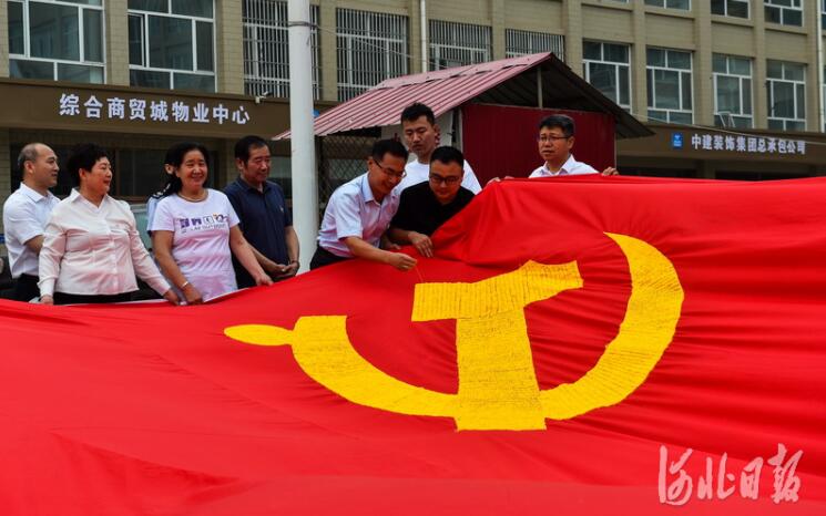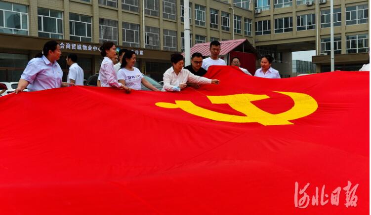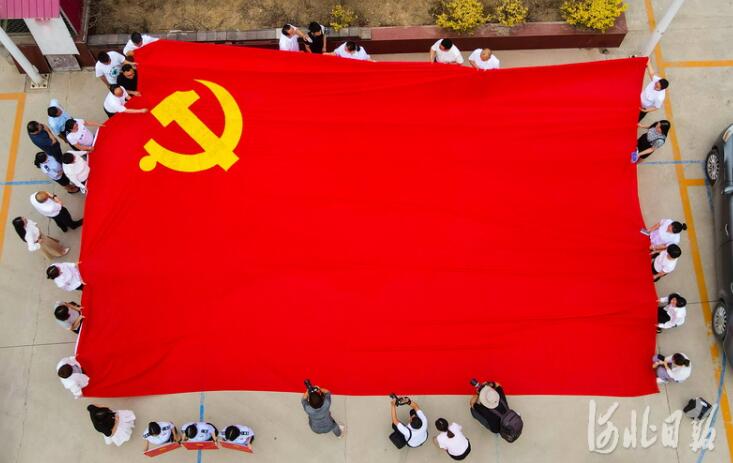 2021年6月9日,雄安新區(qū)的建設(shè)者們同心接力繡黨旗。