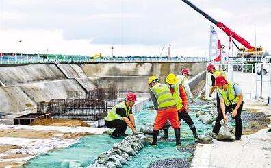 7月12日,施工人員在雄安新區(qū)啟動區(qū)放置沙袋。河北日報記者耿輝 攝