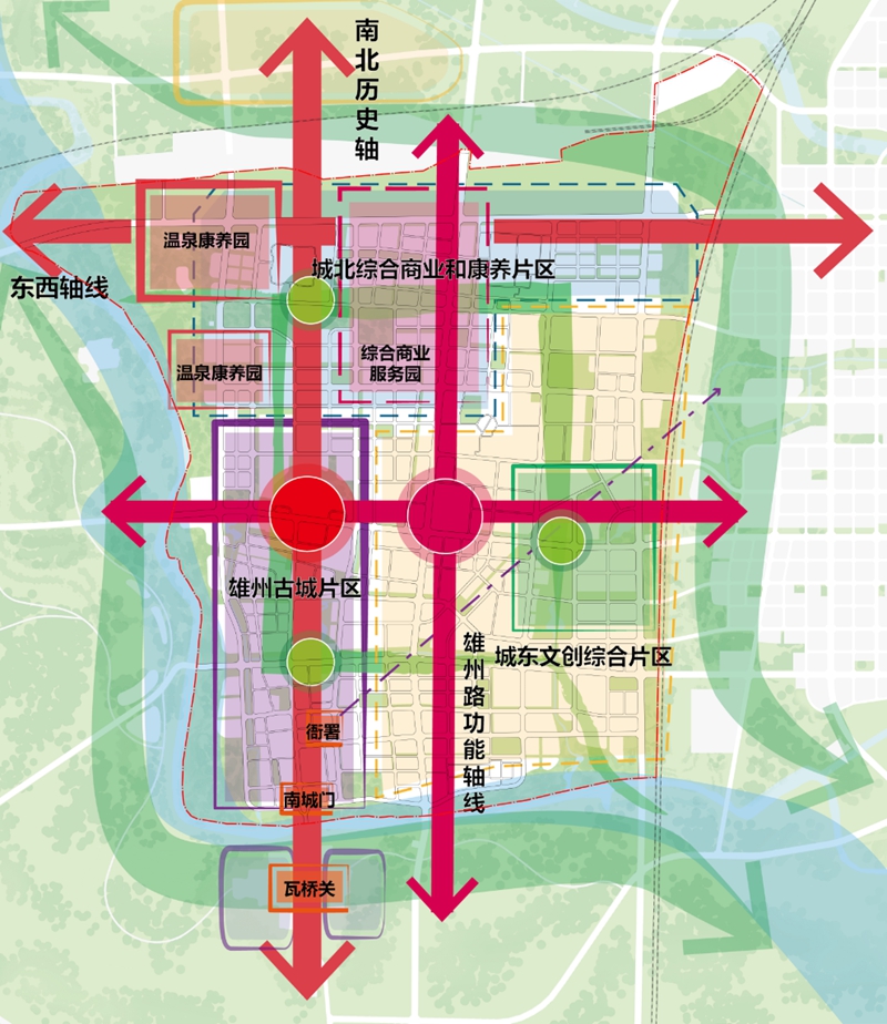 “池面綠陰通易水,樓頭青靄見狼山,漁舟掩映江南浦,使驛差池古北關(guān)”。雄縣組團縣城片區(qū)在白溝引河、大清河、新蓋房分洪道三條水脈的拱衛(wèi)下,仿若一朵秀美荷花,緩緩綻放。規(guī)劃方案遵循其良好的生態(tài)本底與景觀特色,同時溯源雄縣延續(xù)千年的古城形制和歷史街巷格局,整體形成“一水彎環(huán)、雙軸交匯、一城兩片”的空間布局結(jié)構(gòu)。大清河依城而過,南北歷史軸和新區(qū)東西軸交匯于縣城,雄州路和文昌大街交匯形成內(nèi)部功能發(fā)展軸,依托城、關(guān)、河等歷史要素,恢復(fù)雄州古城歷史格局,發(fā)展城東文創(chuàng)綜合片區(qū)、城北綜合商業(yè)和康養(yǎng)片區(qū)。