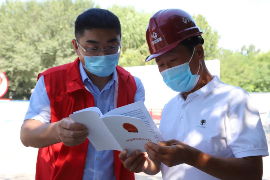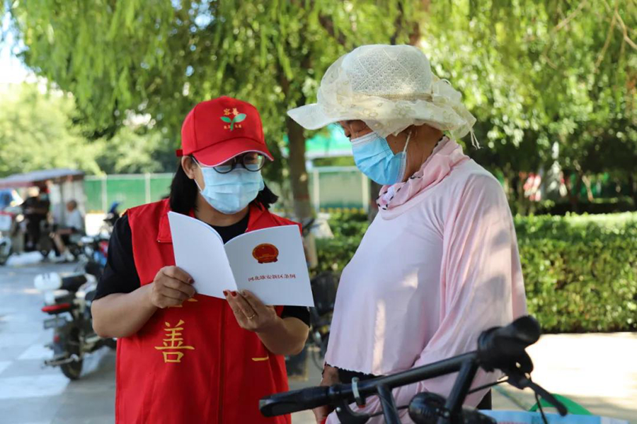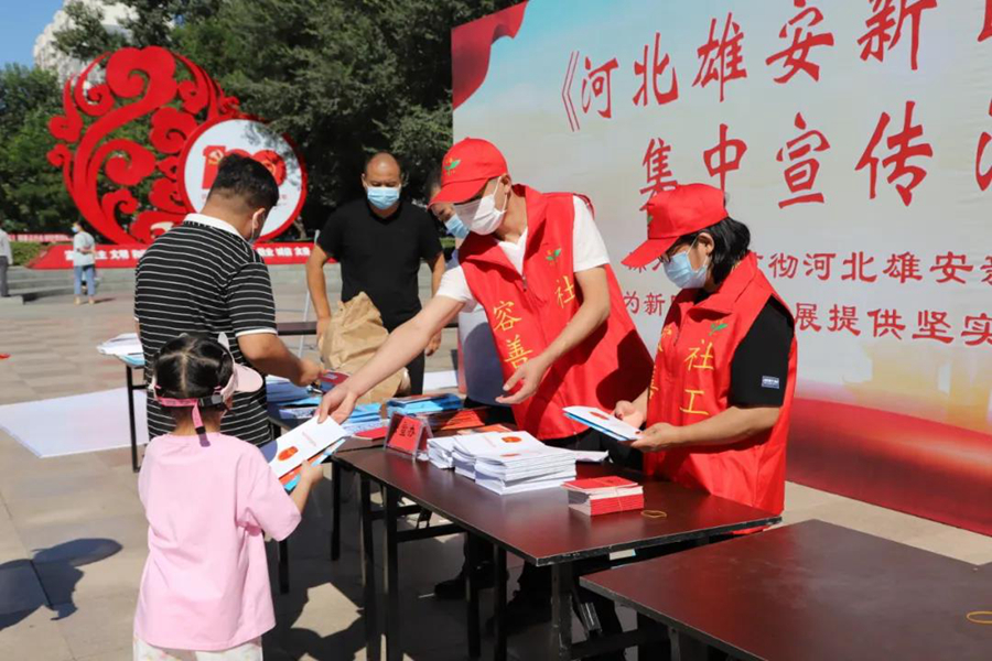 普法宣傳志愿者深入群眾宣傳《河北雄安新區(qū)條例》。