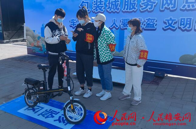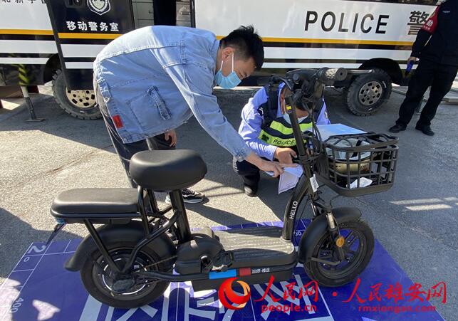 容東片區(qū)服務(wù)點(diǎn)的民警正在查驗(yàn)群眾的電動(dòng)自行車。人民網(wǎng) 劉師豪攝