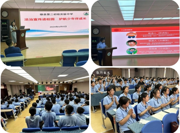 活動現(xiàn)場,雄縣第二初級實驗中學(xué)法治副校長蔡朝陽同志圍繞預(yù)防校園欺凌、河北冀雄律師事務(wù)所律師馮萱圍繞《中華人民共和國未成年人保護法》分別向?qū)W生做了專題講座。通過生動的案例展示和深入淺出的講解,引導(dǎo)學(xué)生樹立法治意識,自覺抵制不良誘惑,切實增強法治觀念和自我保護能力。同學(xué)們對于上述法律法規(guī)以及如何養(yǎng)成良好的行為習(xí)慣有了較為全面的了解,并掌握了基本的法律知識?,F(xiàn)場同學(xué)們專注認(rèn)真地學(xué)習(xí),積極參與互動,活動氣氛熱烈,收獲圓滿。