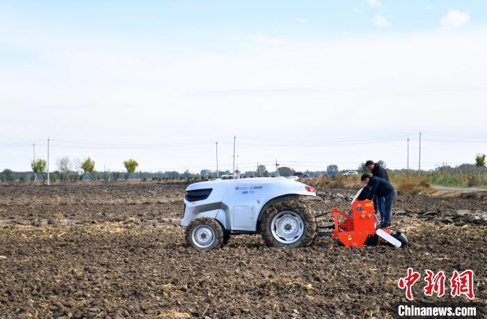 10月22日,河北雄安新區(qū)安新縣端村鎮(zhèn)關(guān)城二村一農(nóng)田內(nèi),“鴻鵠T70”電動智能拖拉機(jī)準(zhǔn)備進(jìn)行秋播作業(yè)。中新社記者 韓冰 攝