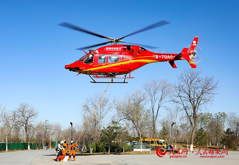 直升機準(zhǔn)備懸吊作業(yè)人員。人民網(wǎng)記者 宋燁文攝