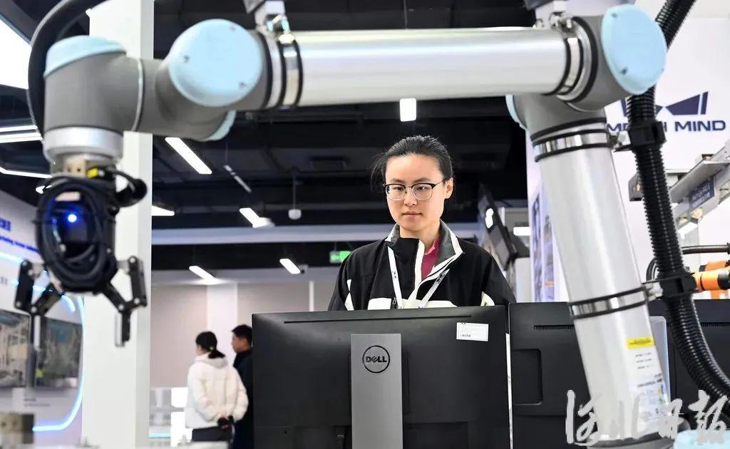 11月28日,雄安新區(qū)中關(guān)村科技園內(nèi),梅卡曼德工作人員為參觀者演示“AI+機器人”新產(chǎn)品。河北日報記者劉光昱 攝