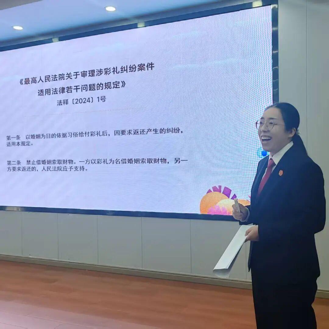 活動現(xiàn)場,干警聚焦兩大主題,以通俗易懂的方式開展宣講。在“弘揚婚嫁新風(fēng)”環(huán)節(jié),法官以《最高人民法院關(guān)于審理涉彩禮糾紛案件適用法律若干問題的規(guī)定》為背景,結(jié)合三個典型案例,深入淺出地講解了群眾關(guān)心的彩禮問題,著力宣傳民法典關(guān)于“禁止借婚姻索取財物”的規(guī)定,引導(dǎo)村民樹立正確的婚戀觀,共同倡導(dǎo)文明鄉(xiāng)風(fēng)建設(shè)。