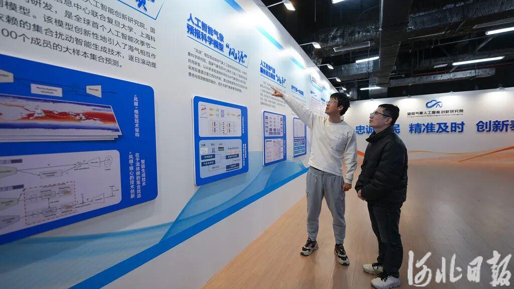 2月6日,在雄安氣象人工智能創(chuàng)新研究院展示大廳,竇則勝和工作人員正在探討人工智能氣象預(yù)報科學模型“風源”。河北日報見習記者李暢攝