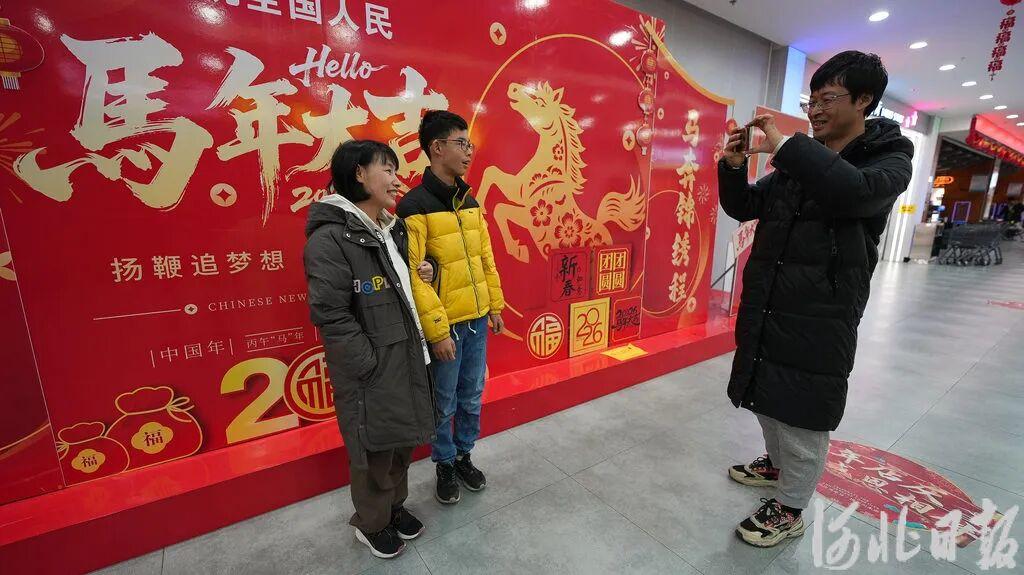 2月6日,竇則勝和家人在雄安奧特萊斯新年背景墻前拍照打卡。河北日報見習記者李暢攝