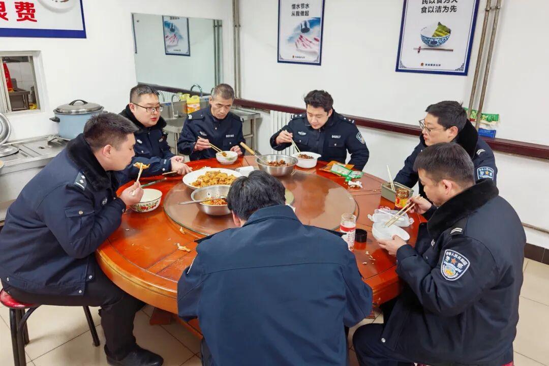 夜幕降臨,晚上七點,走進容城鎮(zhèn)派出所的食堂,值班民輔警圍坐一桌,滿室暖意。