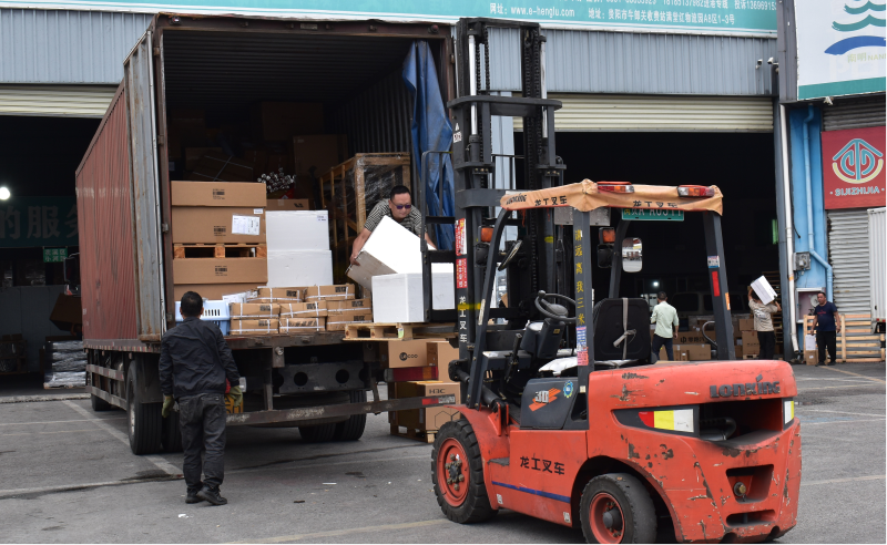 入口處,一輛輛貨車拖著長長的尾箱魚貫駛入;園區(qū)內,100余輛叉車往來穿梭,不停地卸貨、裝貨。
