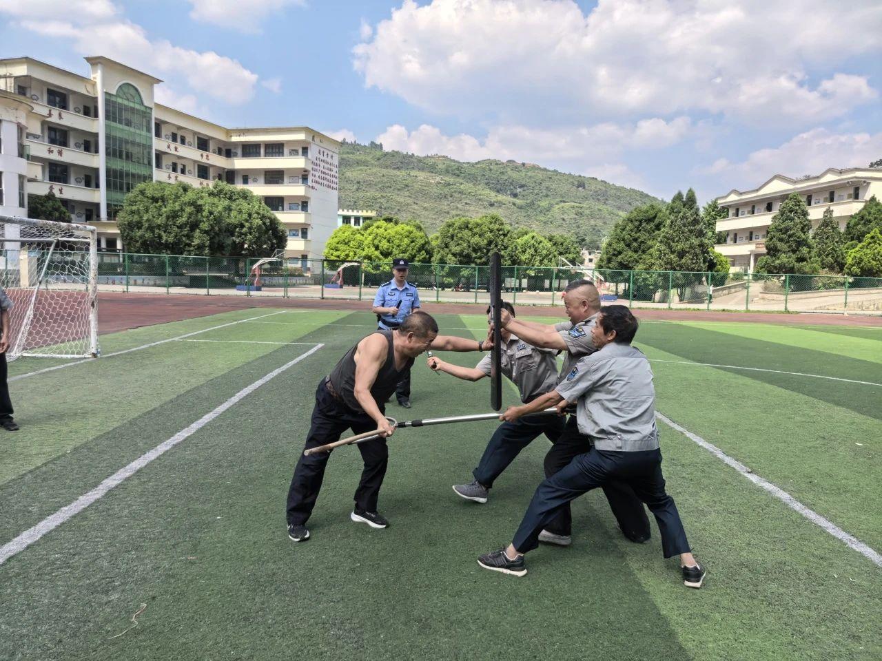 在實(shí)際操作環(huán)節(jié),民輔警們現(xiàn)場(chǎng)演示了盾牌、鋼叉、警棍等警用器械的正確使用方法,從握姿、站位到攻防技巧,每一個(gè)細(xì)節(jié)都講解得細(xì)致入微。隨后,民輔警們組織校園安保人員、教職工分組模擬各種突發(fā)場(chǎng)景開(kāi)展實(shí)戰(zhàn)演練。各小組迅速反應(yīng),緊密配合,在持盾牌防御、持鋼叉控制、及時(shí)報(bào)警并疏散師生等方面,充分展現(xiàn)出“最小作戰(zhàn)單元”的高效協(xié)同能力。