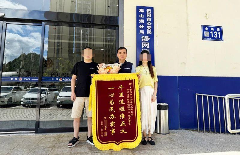近日,群眾羅先生將一面印著“千里追贓維正義 一心為民辦實(shí)事”字樣的錦旗送到了貴州省貴陽(yáng)市公安局觀山湖分局涉網(wǎng)違法犯罪偵防中心,感謝反詐民輔警幫其挽回被騙損失。