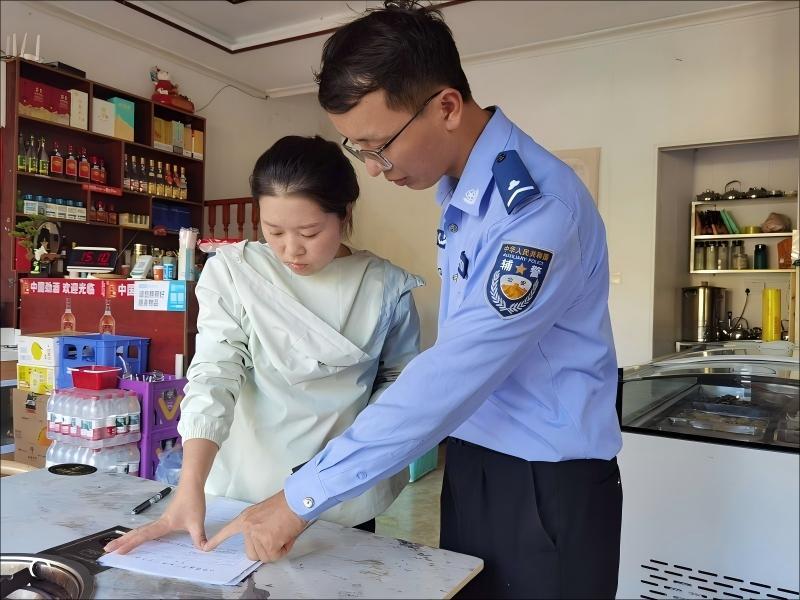 圖為民警向商戶宣傳安全知識(shí)。